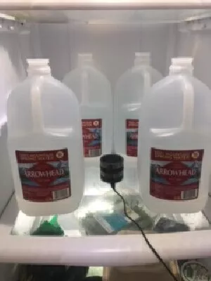 - 3. I drop the bottles into the large container. I have a 5 gallon/20 liter container, and I added 4 bottles of 12 oz Fiji water/300 ml.